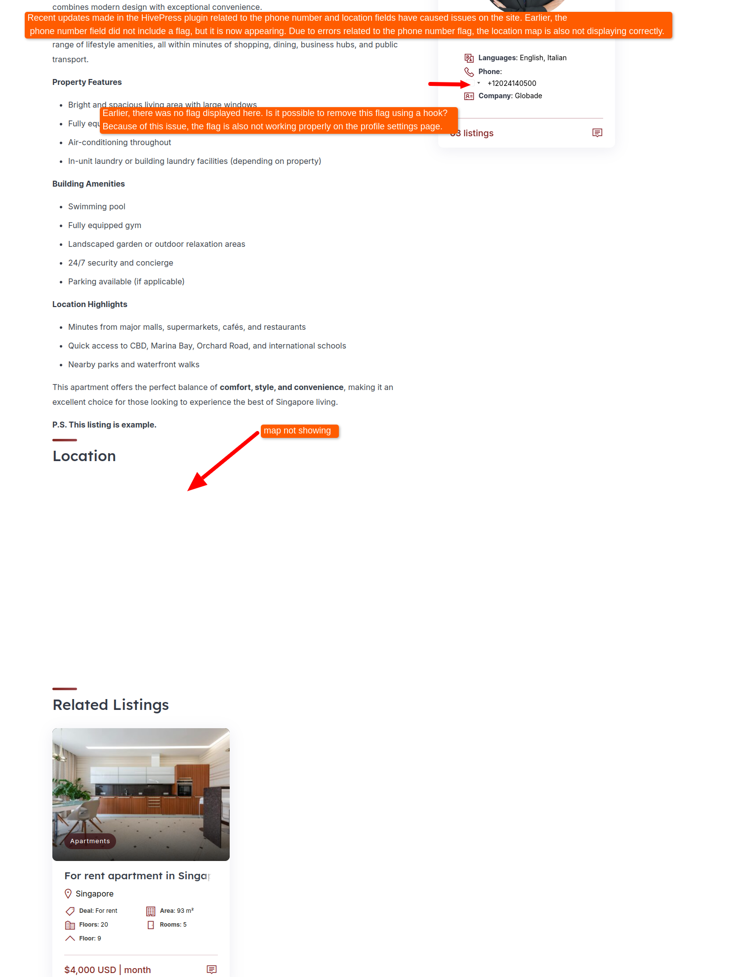The recent update didn’t include any changes or fixes regarding geolocation, so these issues shouldn’t be related to the update. Could you also please confirm if the map issue is related ONLY to listings where the flag is not being rendered, or is it happening across all listings?
